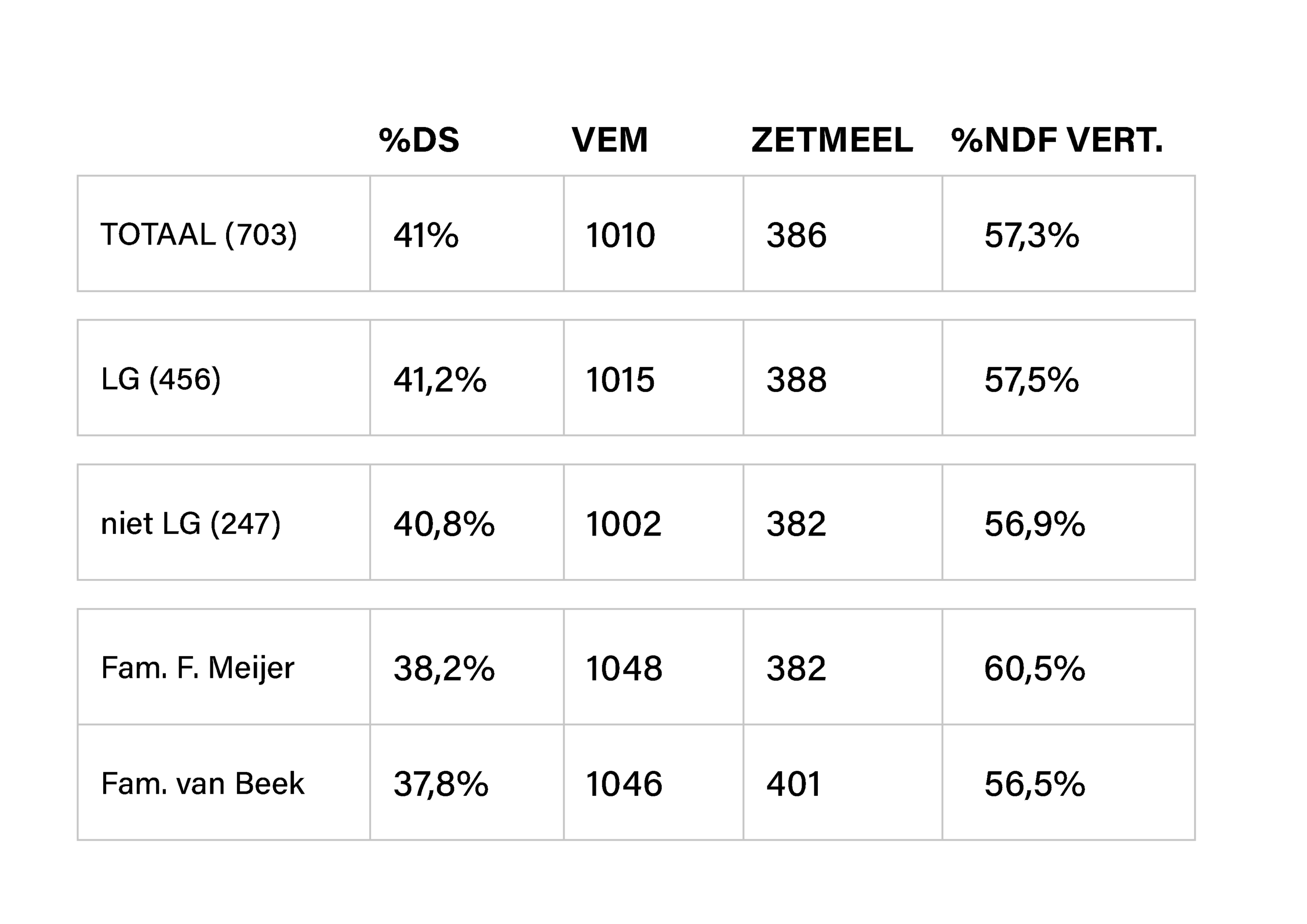 Gemiddeld hadden de kuilen een voederwaarde van 1.010 VEM per kg droge stof, met 386 gram zetmeel en een NDF-verteerbaarheid van 57,3% bij 41% droge stof.